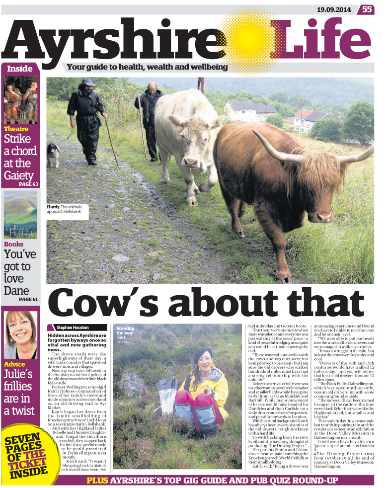 These workshops and events are being run as part of The Droving Project, which also has an exhibition running at the Museum until 31st January 2015. The project involved photographing, filming and recording the sounds as cattle were walked along the old drove road from Knockengorroch to Bellsbank, and the resulting beautiful exhibition has captured the imagination of all who have visited. The Doon Valley Museum, Cathcartson, Dalmellington, is open 10am to 4pm from Thursdays to Saturdays.